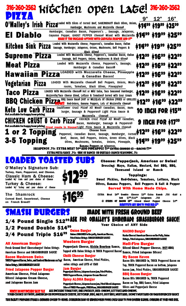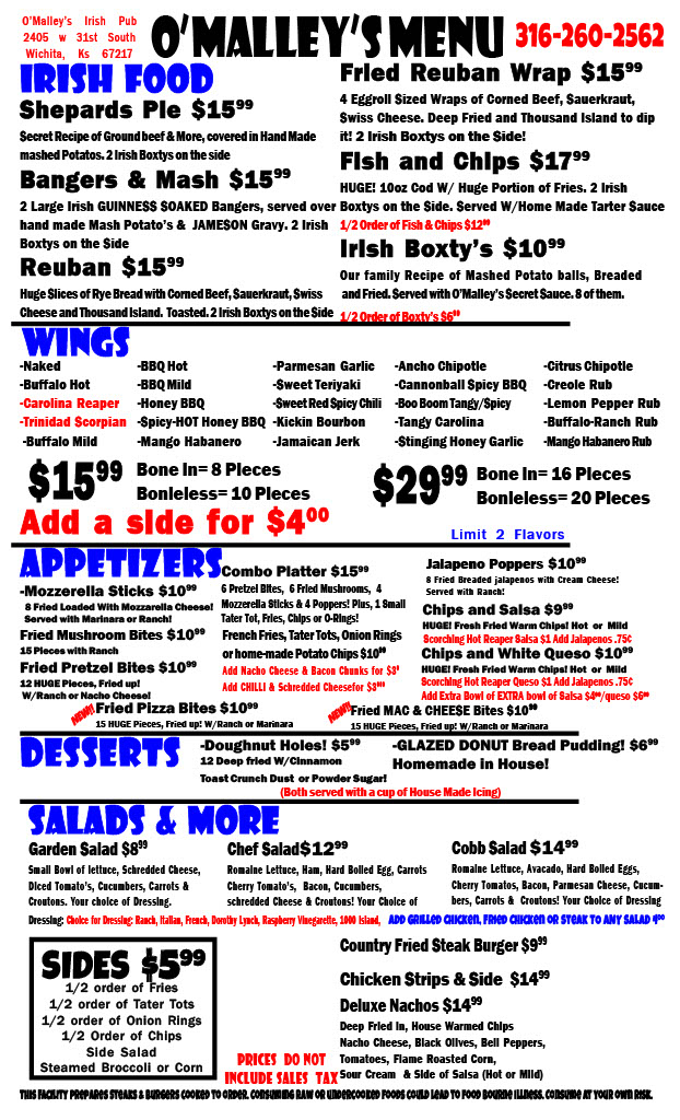 Check out our Menu's in PDF! Authentic made from Scratch Irish Food! Including, Bangers and Mash, Shepard's Pie,, Irish Boxty's, Fish & Chips and of Course the Rueben! Best Wings and Pizza in Wichita! But we also have Burgers, Subs and Several Unique Items!