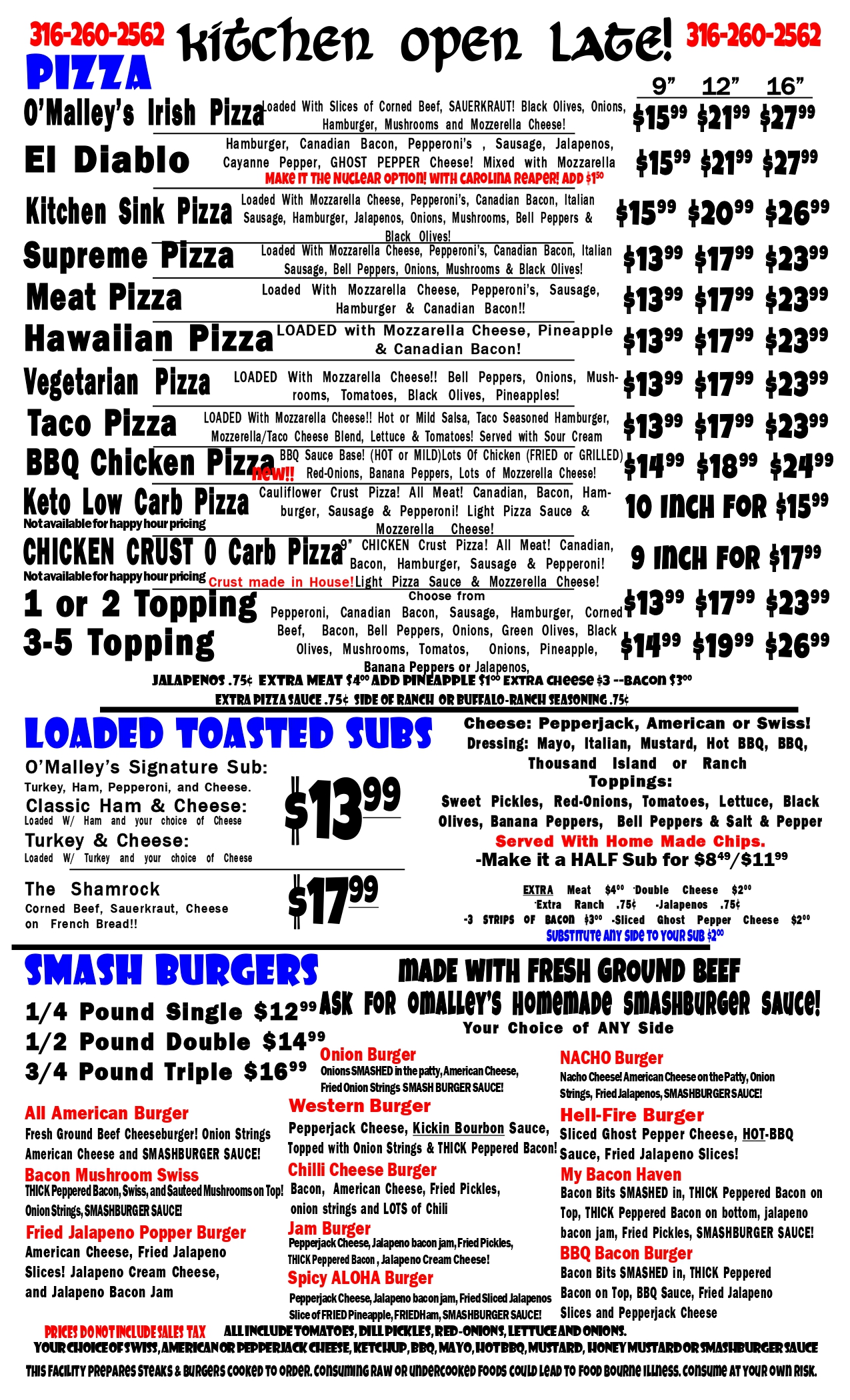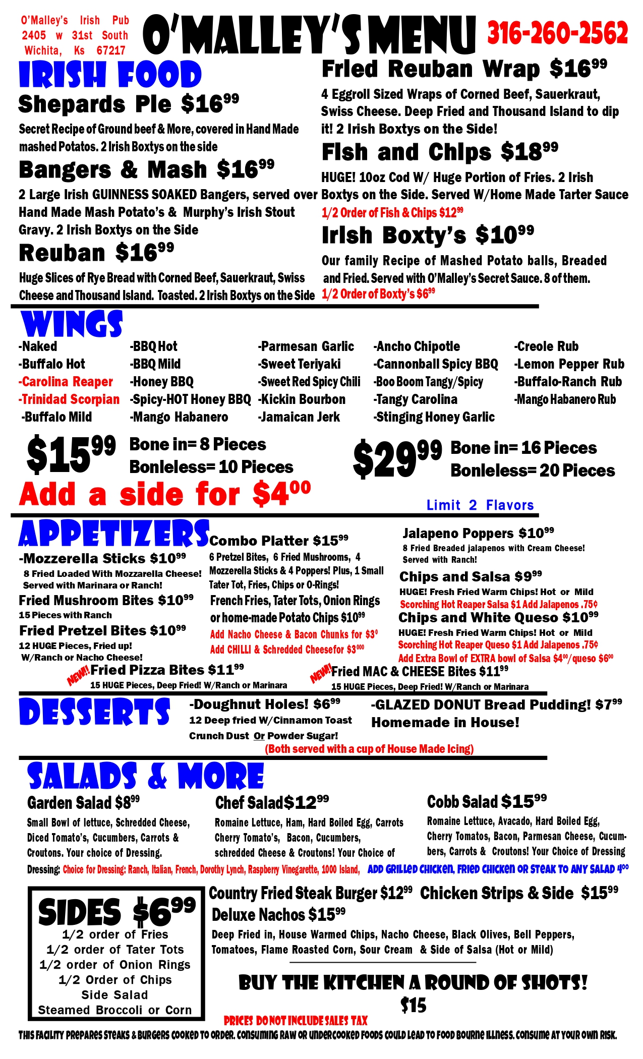 Check out our Menu's in PDF or J-PEG! Authentic made from Scratch Irish Food! Including, Bangers and Mash, Shepard's Pie,, Irish Boxty's, Fish & Chips and of Course the Rueben! Best Wings and Pizza in Wichita! But we also have smashburgers, Subs and Several Unique Items!
